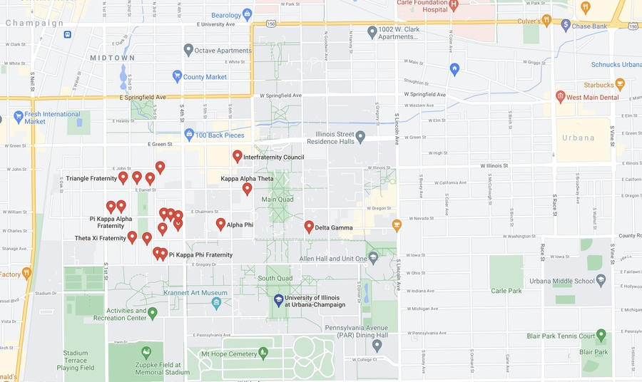 以下是UIUC兄弟兄弟姐妹會位置,據說附近常開趴然後會有喝kiang的人出沒,怕吵的記得避開這一帶。First St. 到 Oak St. 間雖然沒有什麼兄弟姊妹會但是很多undergrads住,也偏吵。