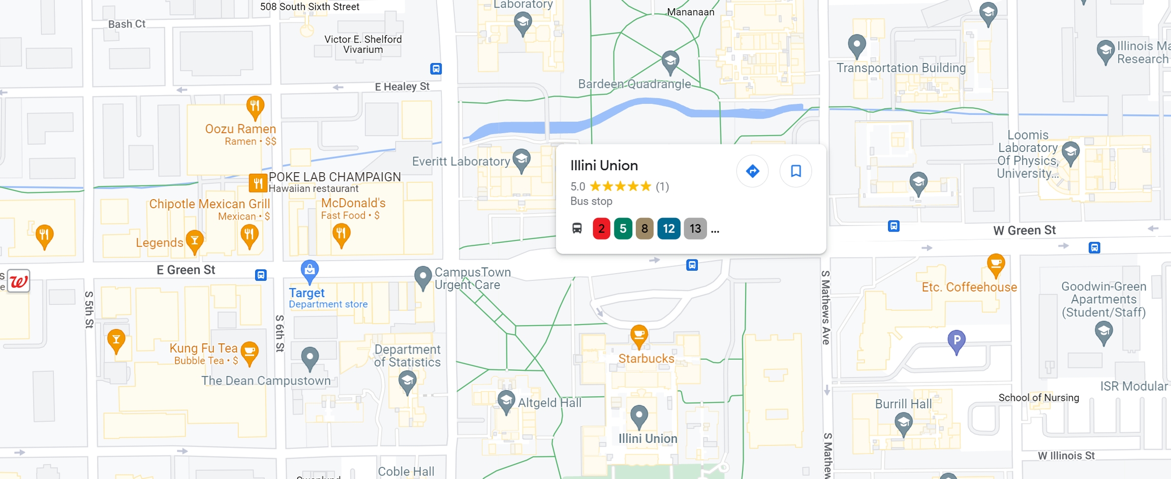 香檳的公車非常的方便,營運的公司叫做 MTD。用 Google 地圖可以看到香檳不同地標附近公車站會有哪一號公車經過,Google 的路線也大多是精確的,但是不要用 Google 等公車,進站時間還是其他軟體比較準確。除了官方推薦的軟體,Android 我自己很喜歡 Transit (需要美國Play Store Account)。對了,學生坐MTD不用錢 (應該說已經包含在學雜費裡面了)。